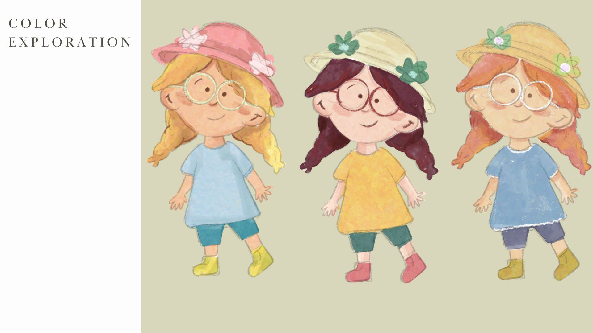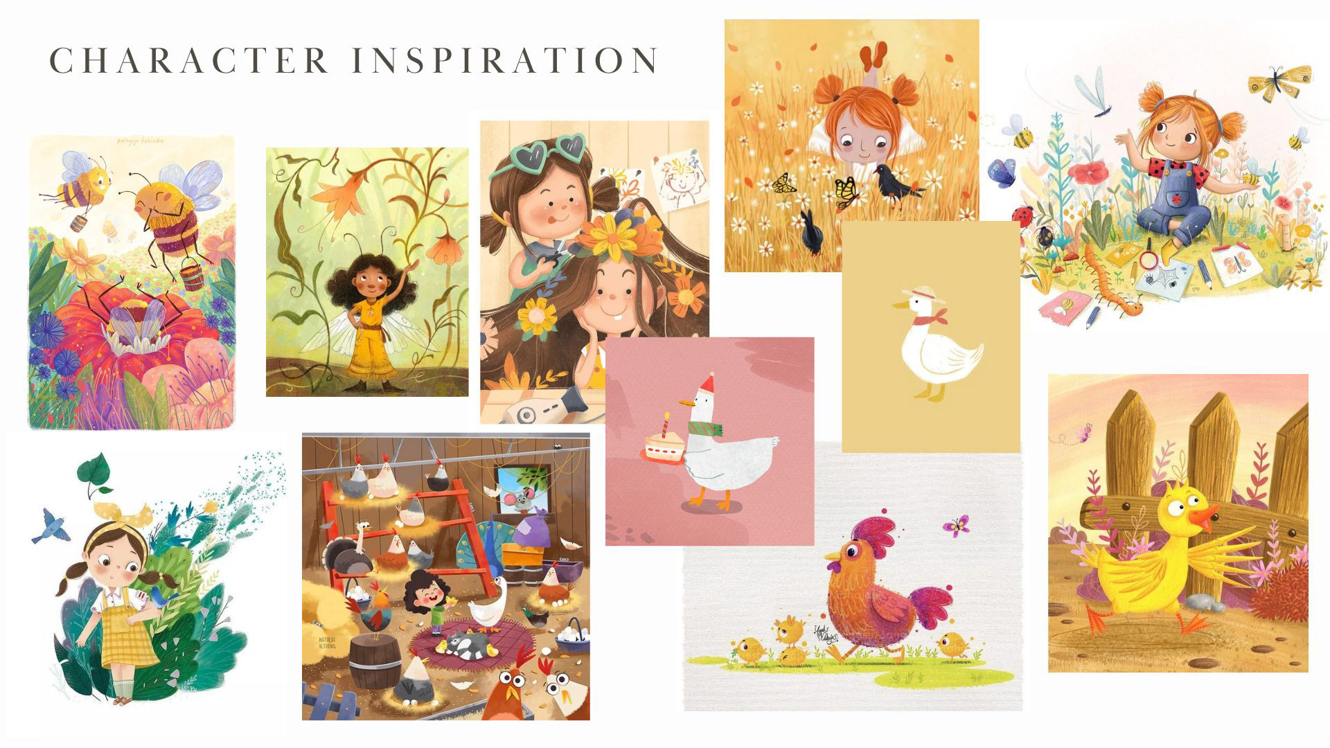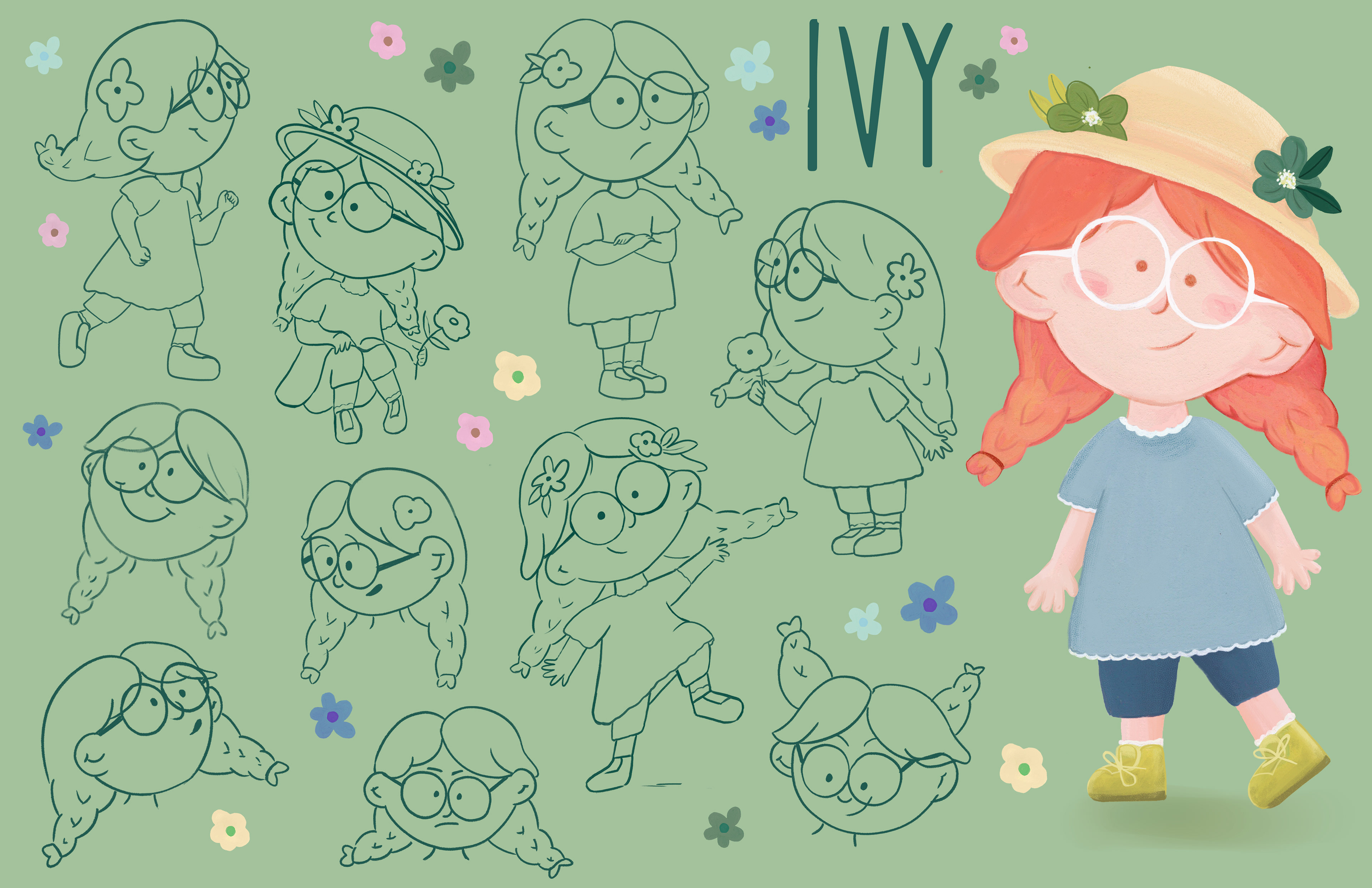 Character design for a children's book about a young girl on a farm who looses her best friend, Dena the duck. Ivy must go on an adventure to find her friend but along the way, she discovers coping skills and problem solving