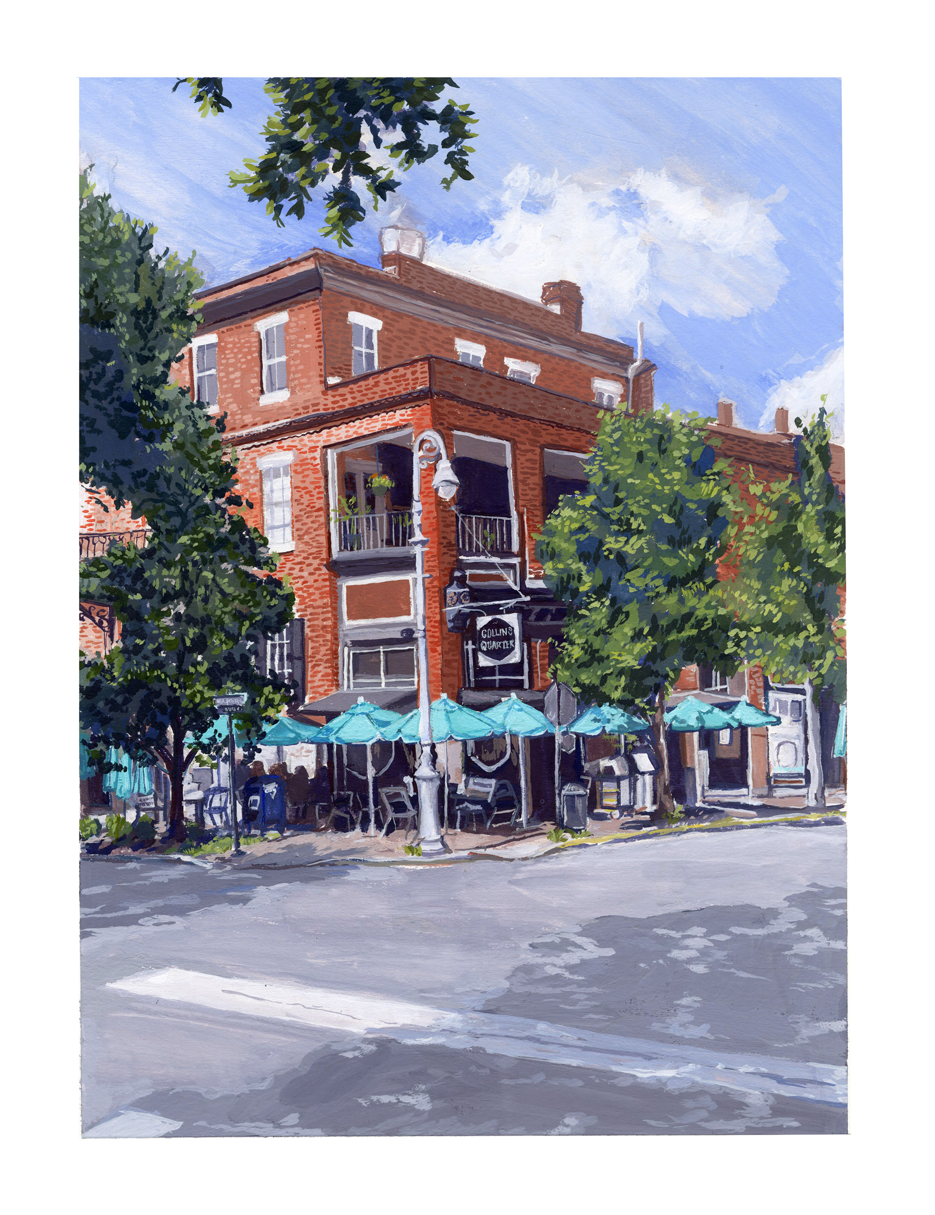 Gouache painting of Collins Quarter, a favorite building of mine in Savannah Georgia. Painted only using four colors: Cadmium red, Ultramarine Blue, Lemon Yellow, turquoise and white.