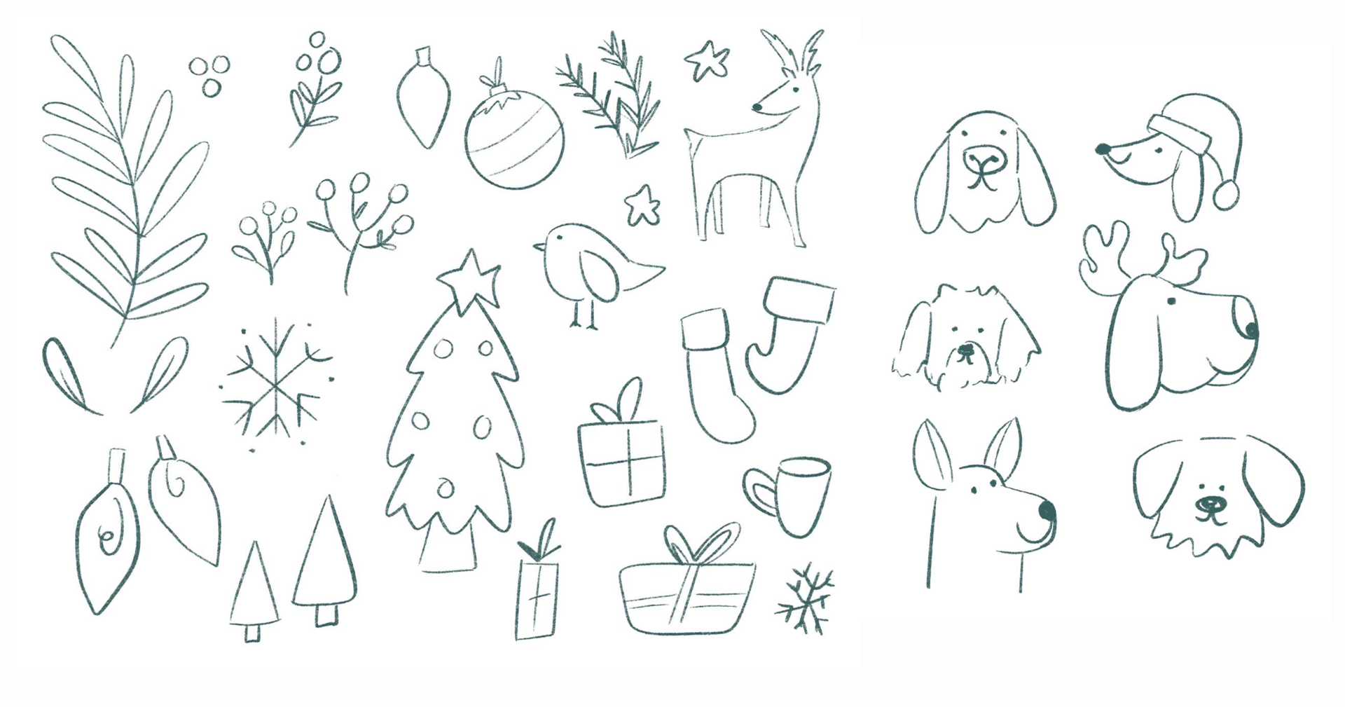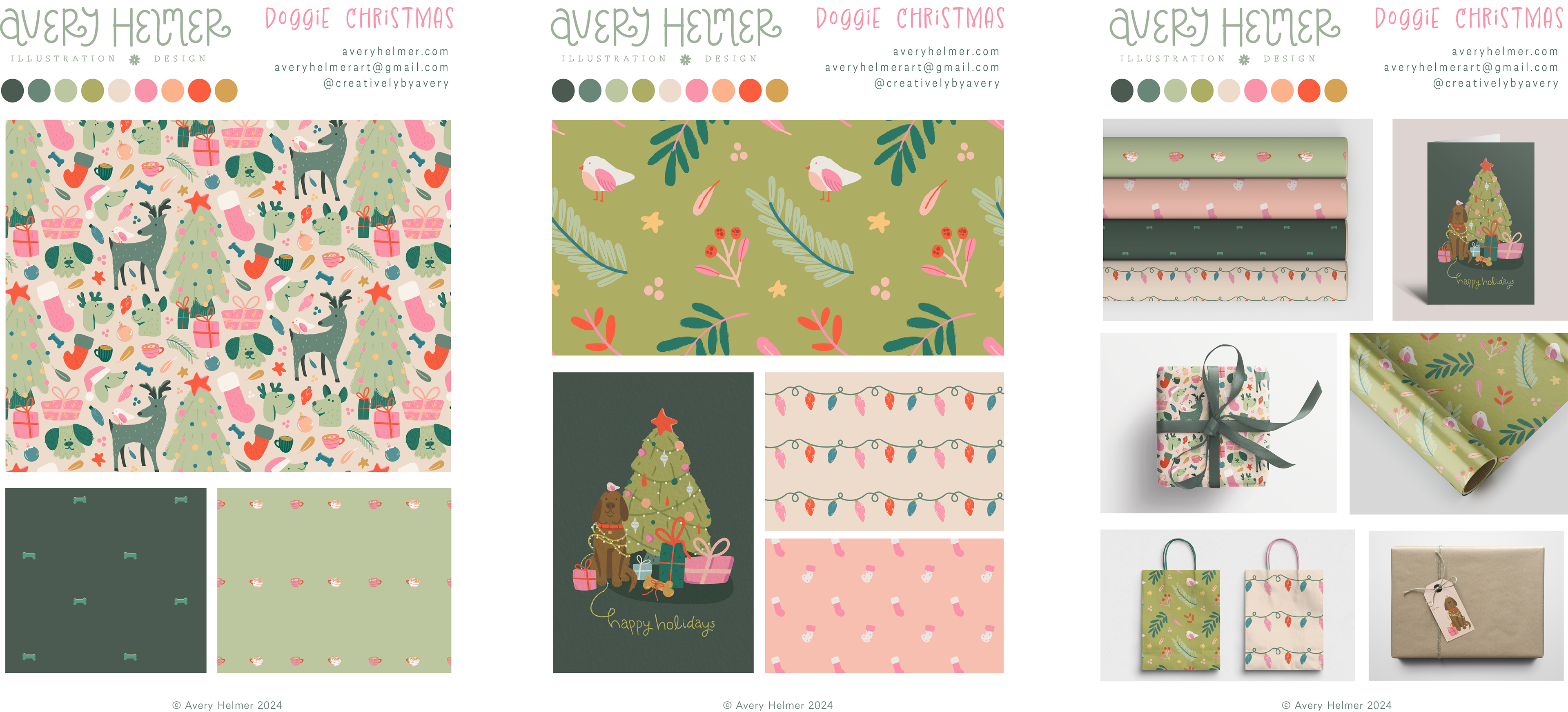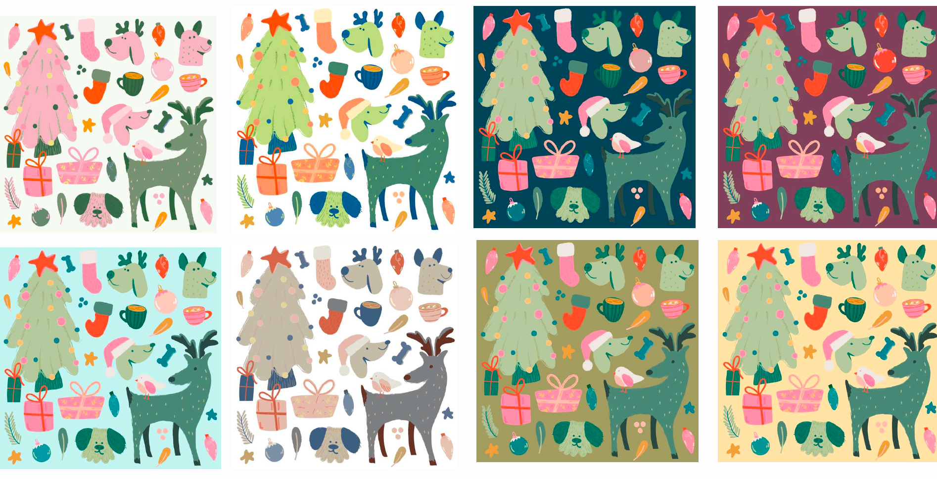 This was a Christmas holiday-inspired collection depicting cute doggies and nature elements. I chose a soft color palette, as opposed to traditional colors
