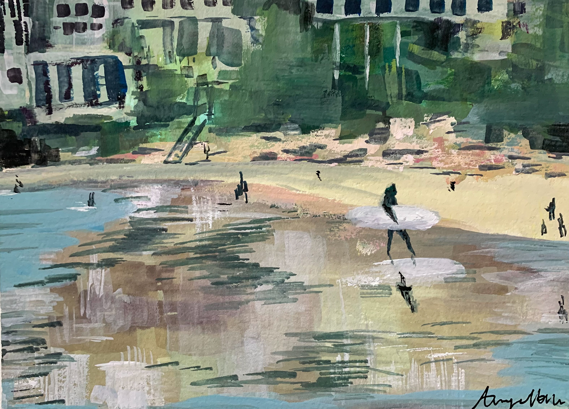 Gouache painting of Freshwater Beach, in Sydney Australia, completed 2021 5x7